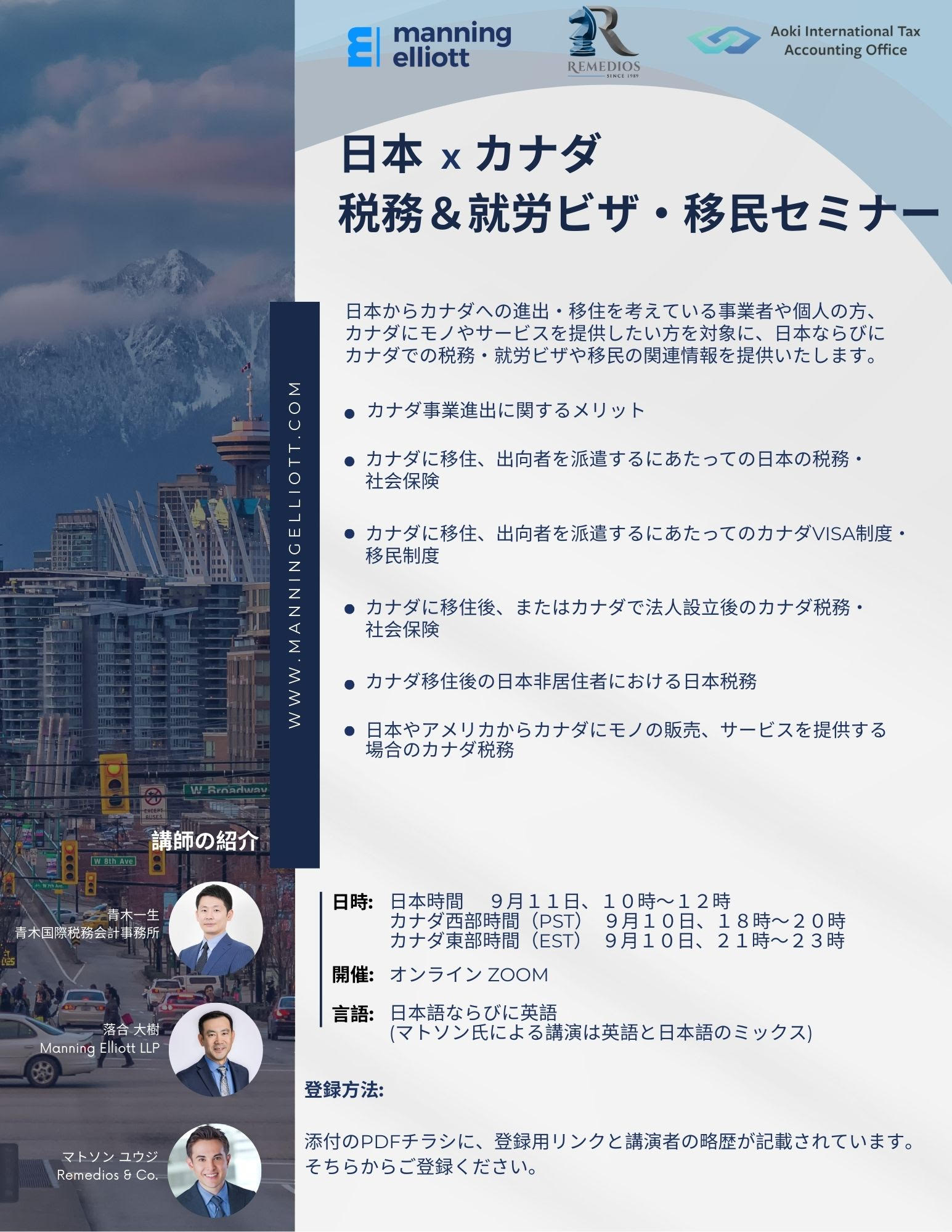 セミナー内容 日本からカナダへの進出・移住を考えている事業者や個人の方、カナダにモノやサービスを提供したい方を対象に、日本ならびにカナダでの税務・就労ビザや移民の関連情報を提供いたします。 日時 日本時間 2025年9月 […] -